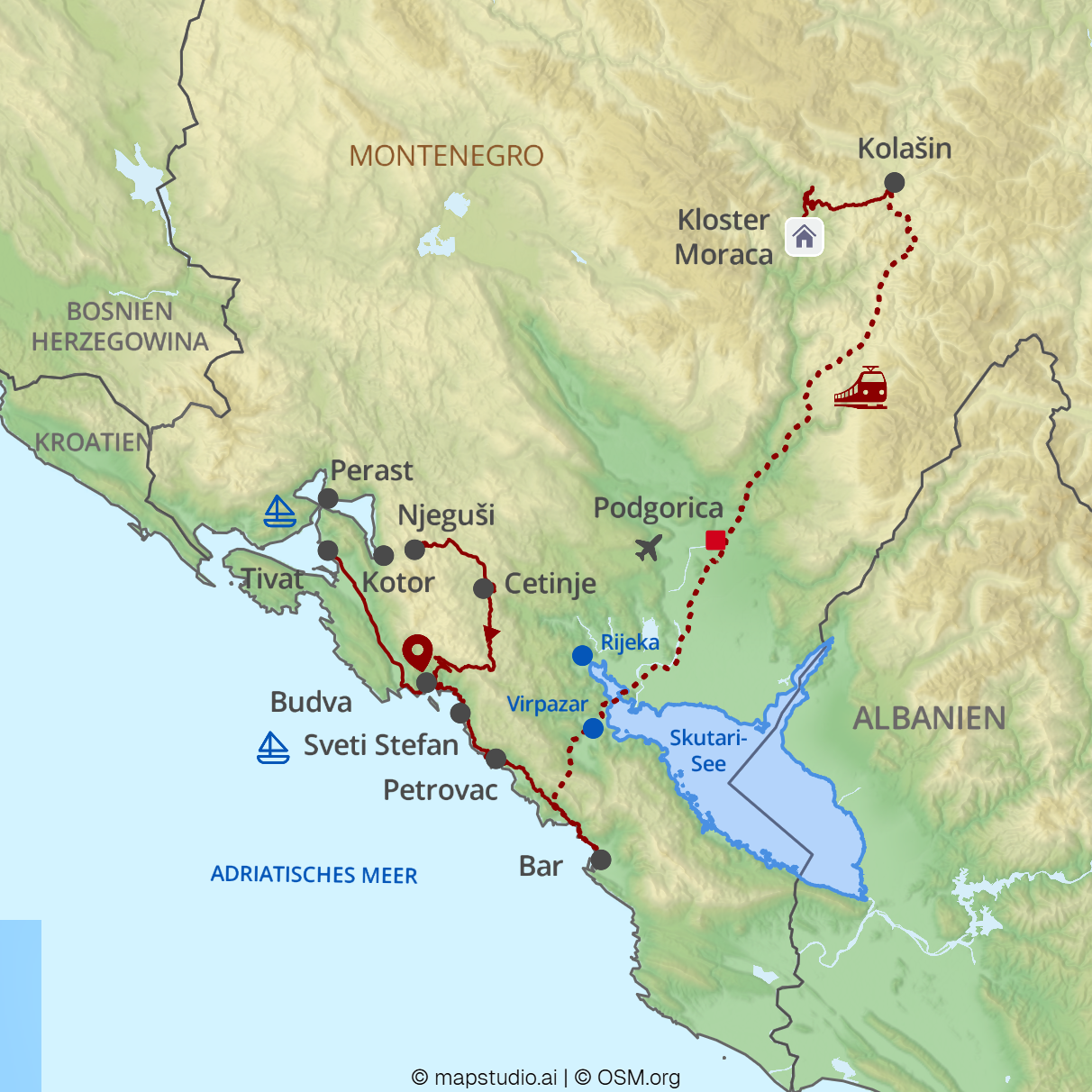 - Durchgehende, deutschsprechende Reiseleitung in Montenegro laut Programm ab/bis Flughafen